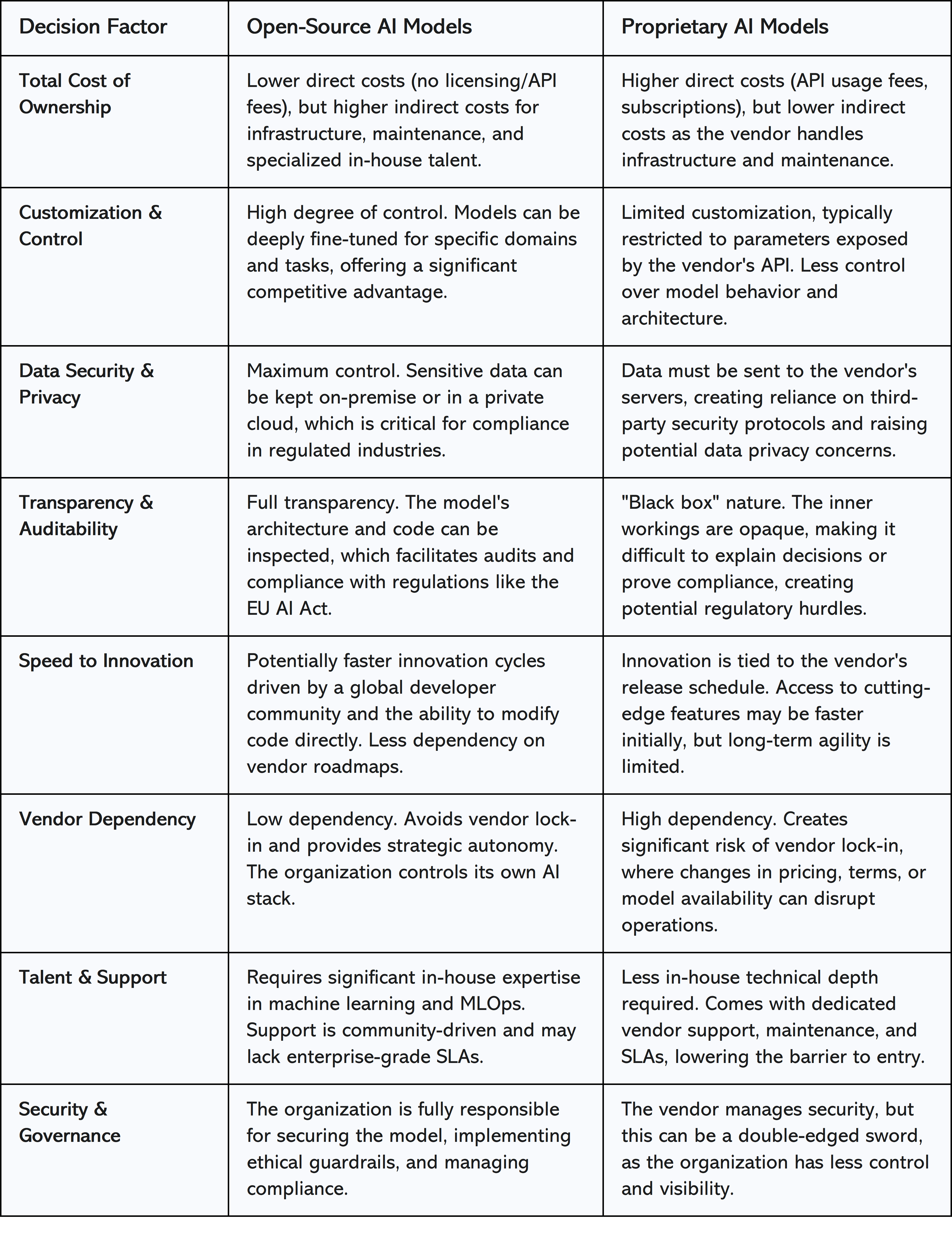 The decision between open-source and proprietary AI involves a series of trade-offs across cost, control, security, and innovation. There is no singular optimal choice, and the best decision depends on an organization's specific strategic goals, resources, and risk tolerance.